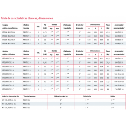 Caudal máximo: hasta 28 m3/h en grupos monofásicos y hasta 36 m3/h en grupos trifásicos. Altura máxima: hasta 90 mca. Potencia máxima de la bomba: 4 kW. Fluido para bombear: agua fría